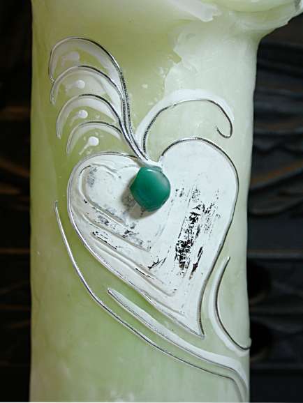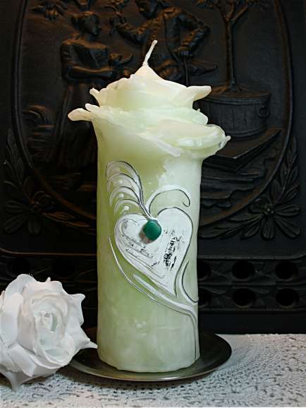 Handgearbeitete Mantelkerze, Unikat, in Rosettenform mit Herz und Halbedelstein. Eine rosettenartige Auffächerung von Wachs ummantelt eine qualitativ sehr hochwertige Kerze. Der Mantel ist in einem zarten Grün und geeist. Der Wachsmantel brennt nicht ab. Die Kerze kann also lange brennen, ohne dass die äußere Form zerstört wird. Der Mantel wirkt wie ein Kerzenglas. Unikat.