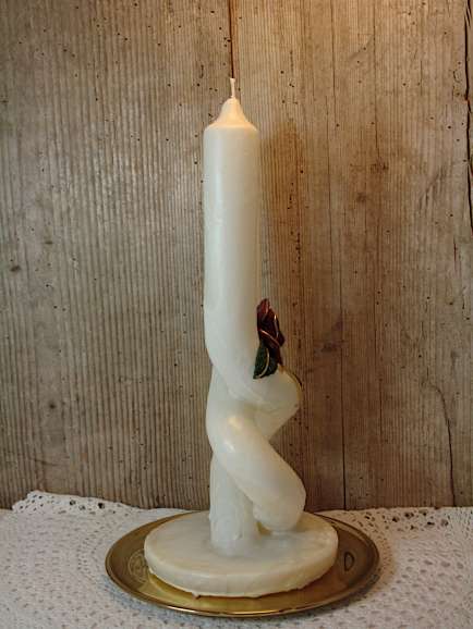 Elegante und extravagante Hochzeitskerze gestaltet aus zwei miteinander verdrehten Altarkerzen. Eine plastisch modellierte Wachsrose verbindet beide Kerzen miteinander. Der Wachssockel hat einen Durchmesser von 120 mm.
