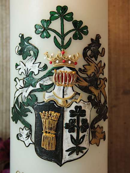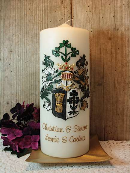 Große Hochzeitskerze mit Wappen in reiner Wachsauflage.
