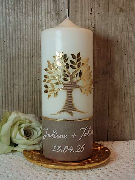 Schlichte Hochzeitskerze mit Lebensbaum. Das Motiv ist mit Wachs auf die Kerze aufmodelliert. Ein bräunlicher Sockel schmückt diese Kerze.