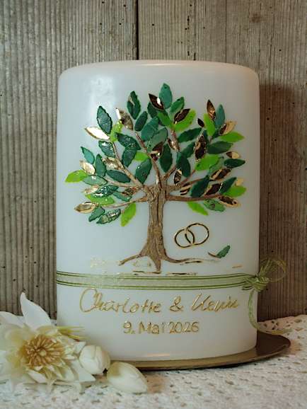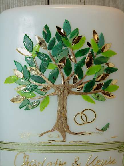 Ovale Hochzeitskerze mit Lebensbaum. Bei dieser Hochzeitskerze dominiert ein mit Wachs aufgelegter Lebensbaum. Jedes Blatt des Baumes ist einzeln auf die Kerze aufmodelliert. Das passende Schleifenband vervollständigt das Gesamtbild der Kerze. Reine Wachsauflage.