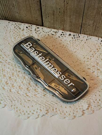 Bastelmesser Set. Das Bastelmesser hat 6 verschiedene Klingen, die in einen stabilen Metallgriff eingesetzt werden. Der Messergriff liegt durch die Gummierung für die Finger gut in der Hand und verhindert ein Abrutschen. Am hinteren Ende des Metallgriffs ist ein Magnet eingelassen, mit dem man die Klingen bequem aus den Fächern aufnehmen kann.