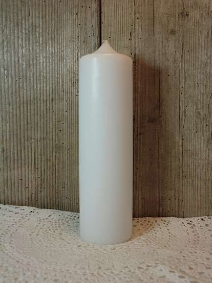 Weiße Kerze mit den Maßen 25 cm x 6 cm.