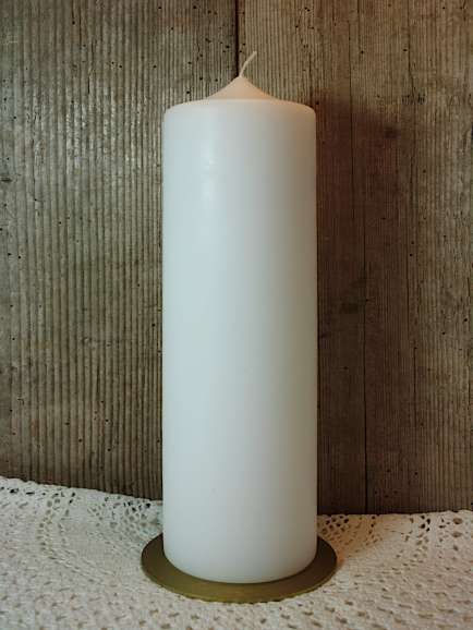 Weiße Kerze mit den Maßen 30 cm x 8 cm.