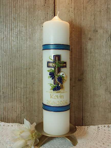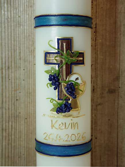 Kommunionkerze mit Kreuz, Kelch und Wein. Diese Kerze passt zum Thema: Jesus Brot des Lebens.