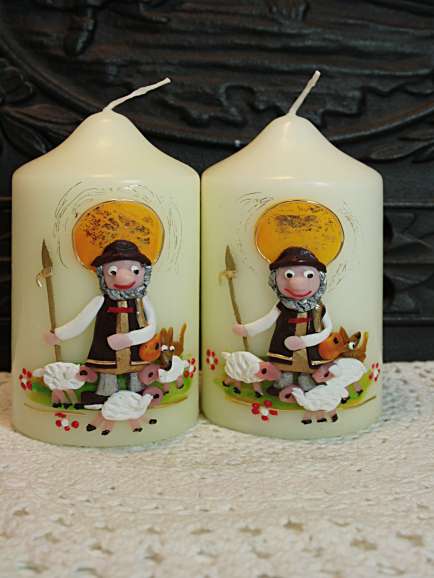 Patenkerze zur Taufkerze Heinz, mit Sonne, plastisch modelliertem Hirten und Schaf.
