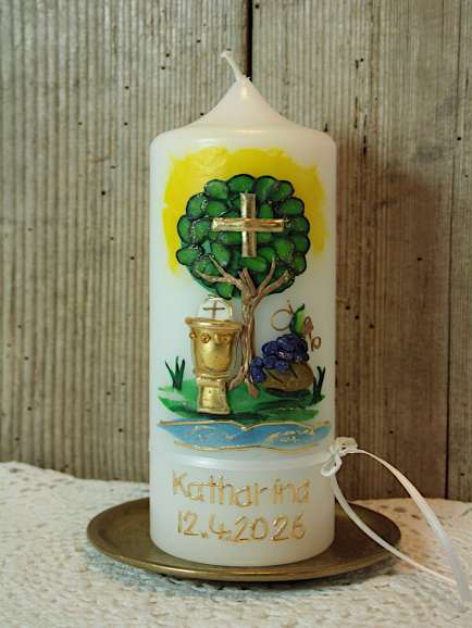 Patenkerze mit Lebensbaum, Kelch, Brot und Wein. Diese Patenkerze ist passend zur Kommunionkerze Pius gestaltet.