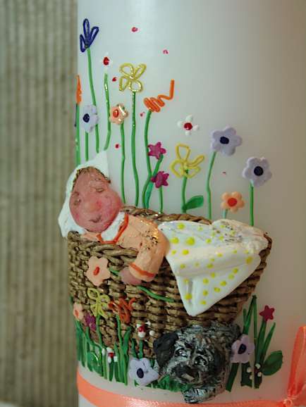 Taufkerze mit Baby in Weidenkorb. Das Motiv ist mit Wachs auf die Kerze aufmodelliert.