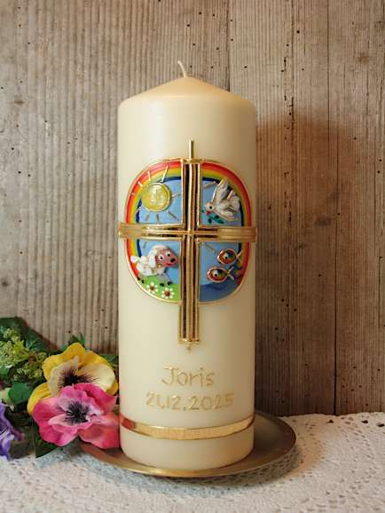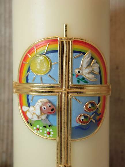 Taufkerze mit goldfarbenem Kreuz und den Symbolen Osterlamm, Sonne, Fisch und Taube. Diese Kerze wurde nach einem zugesendeten Entwurf gestaltet.