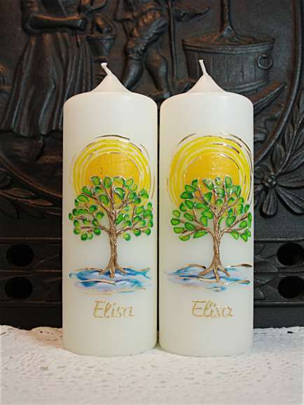 Tischkerze mit Lebensbaum, Sonne und Wasser.