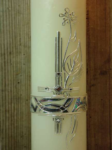 Schlichte und elegante Erinnerungskerze mit Ornamentband um die gesamte Kerze. Die Kerzenoberfläche ist perlmuttschimmernd veredelt. In das Band ist ein Kreuz mit Glassteinchen eingearbeitet. Reine Wachsauflage.