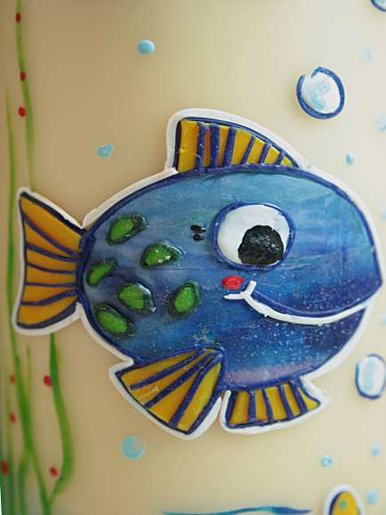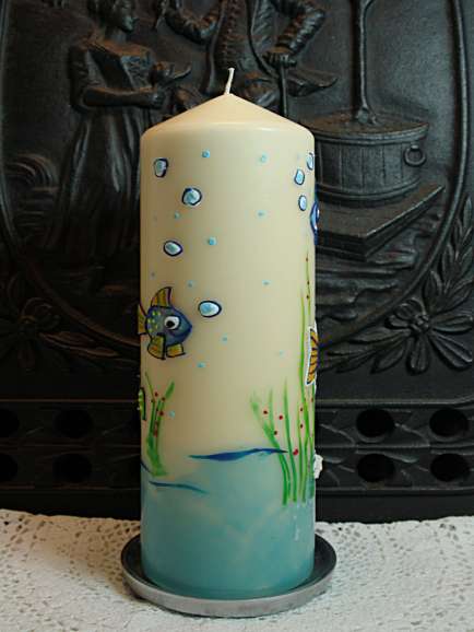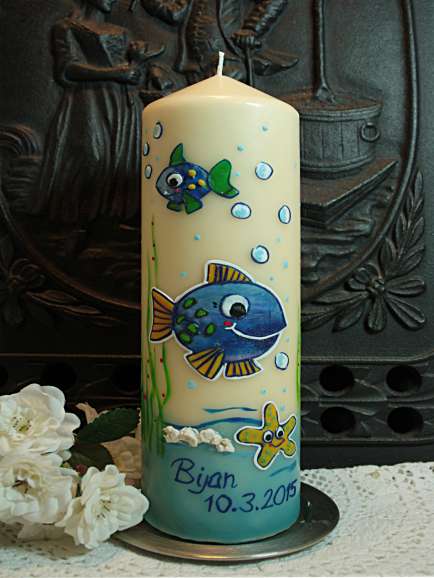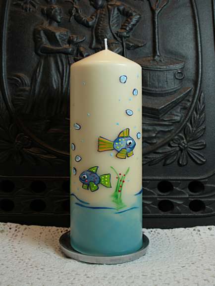 Fröhliche Geburtstagskerze mit großem Fisch und vielen kleinen Fischen. Die Fische sind reliefartig auf die Kerze aufmodelliert. Der Sockel der Kerze ist in Blau gehalten. Bitte bestellen Sie die Beschriftung der Kerze extra.