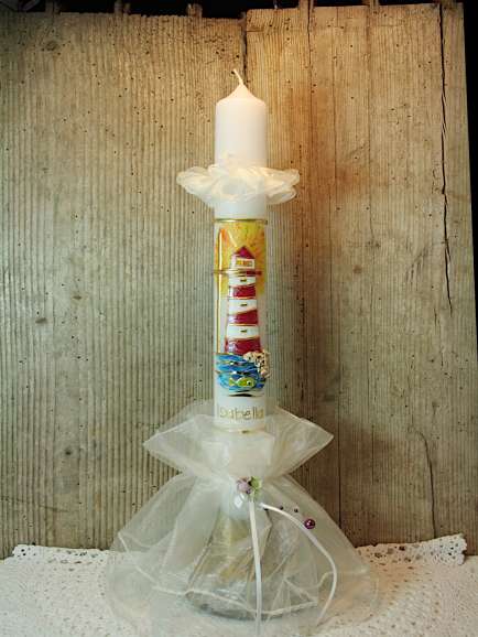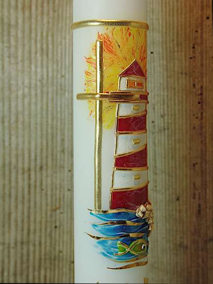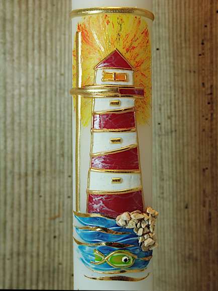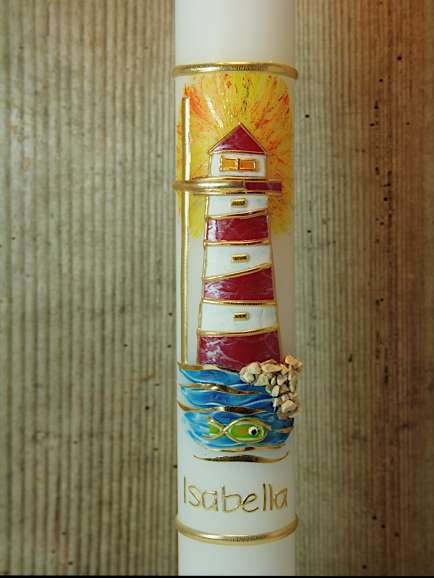 Kommunionkerze mit Leuchtturm und goldfarbenem schlichten Kreuz. Ein strahlender Leuchtturm steht bei dieser Kerze im Mittelpunkt. Dieser wird von einem zarten Kreuz, Wasser und Kieselsteinen ergänzt. THema :"Zeig mir den rechten Weg".