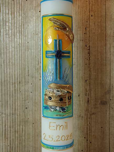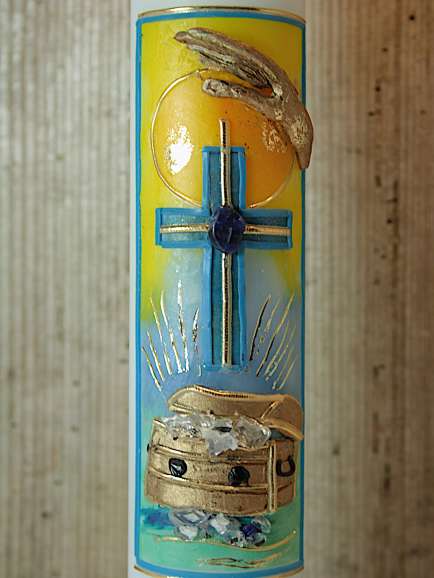 Farbenfrohe Kommunionkerze mit Kreuz, Sonne und Schatztruhe passend zum Thema: "Wir suchen einen Schatz". Diese Kommunionkerze besticht durch Ihre fröhliche Farbigkeit. Das Motiv ist in reiner Wachsauflage auf die Kerze aufgelegt. Die Schatztruhe hat einen reliefartigen Charakter und ist mit kleinen Steinen dekoriert. Reine Wachsauflage.