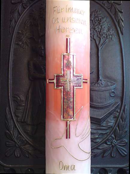 Riesige Erinnerungskerze mit rot-marmorierter Oberflächengestaltung, edlem Kreuz und zarter goldfarbener Taube. Sonderanfertigung im Kundenauftrag.