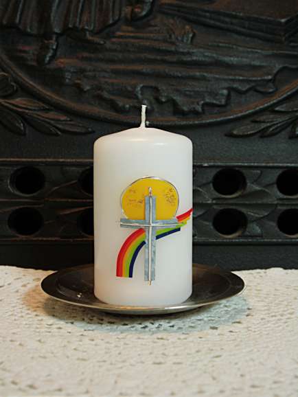 Gastkerze mit Kreuz und Sonne und Regenbogen.