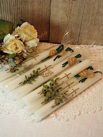 Gastkerzen mit Kreuz und Olivenzweig passend zur Taufkerze Heinz. Der Preis bezieht sich auf 1 Stück.