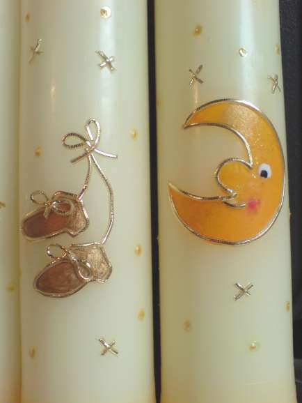 Gastkerze mit farbigem Sockel und Motiv.