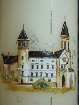Sonderanfertigung einer Hochzeitskerze mit Schloss Bredenfelde. Bei dieser Kerze ist das Schloss mit Wachs auf die Kerze aufmodelliert. Ein zartes Kreuz ist im Hintergrund der Kerze so angebracht, dass das Gesamtbild der Kerze nicht gestört wird. Sonderanfertigung.