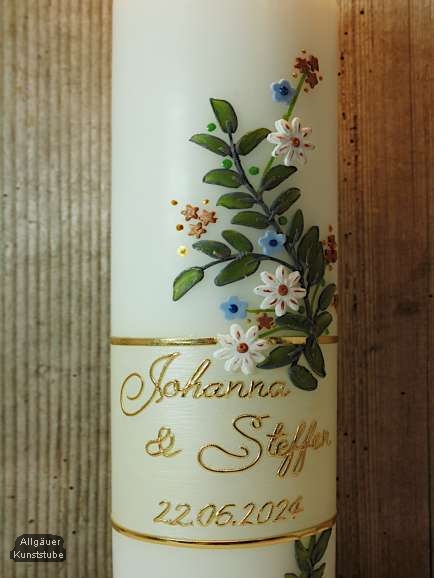 Schlichte und sehr elegante Hochzeitskerze mit Banderole und Blütenzweig. Diese Hochzeitskerze besticht durch Ihre schlichte Eleganz. Einzelstück.