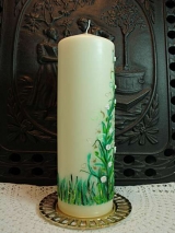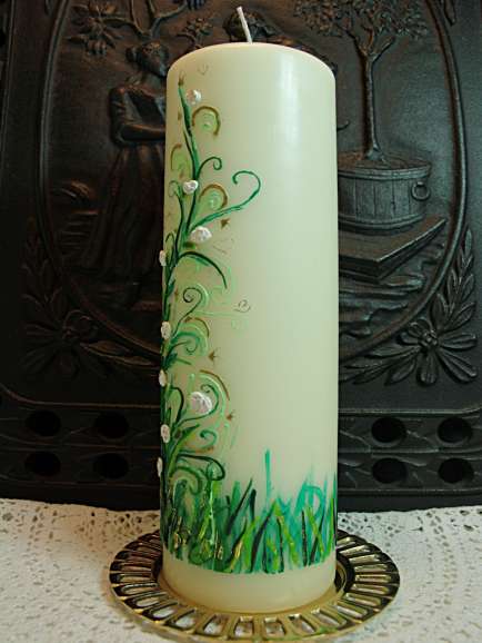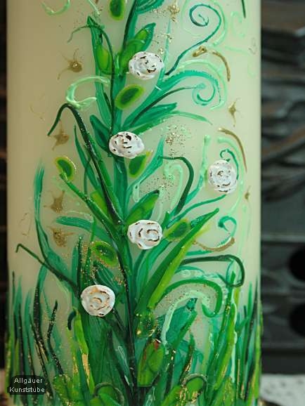 Große Hochzeitskerze mit zartem Motiv. Zarte Grashalme sind um die gesamte Kerze gestaltet. Auf der Vorderansicht der Hochzeitskerze ranken lange Grashalme fast über die gesamte Kerzenlänge. Kleine Blüten und hauchdünne Herzchen vervollständigen das Gesamtbild. Durch die verschieden Grüntöne und die sehr feine Wachsauflage wirkt diese Hochzeitskerze verspielt und sehr frisch. Reine Wachsauflage. Einzelanfertigung.