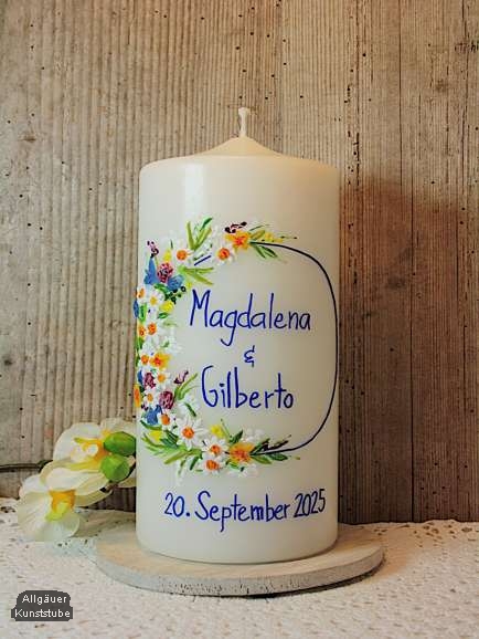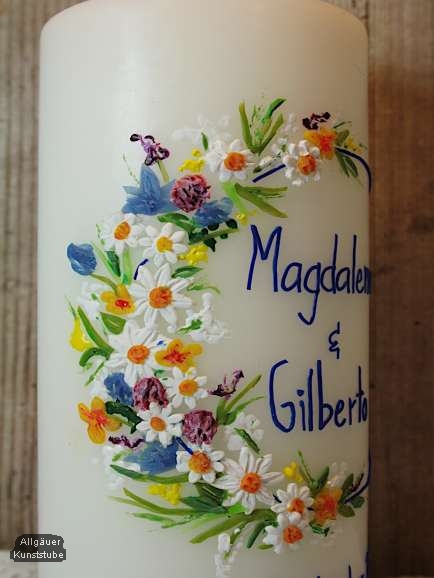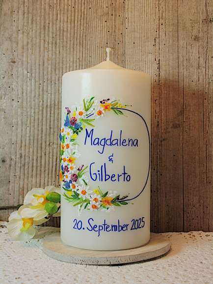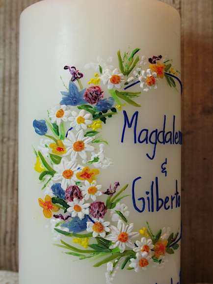 Fröhliche Hochzeitskerze mit leuchtendem Blütenkranz in der Farbe der Hochzeitsblüten. Jede Blüte ist einzeln auf die Kerze aufmodelliert.