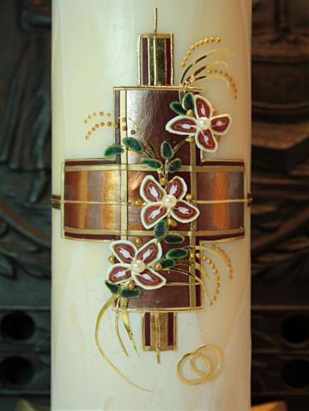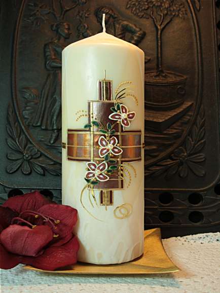 Hochzeitskerze mit breitem Kreuz und Ringen.