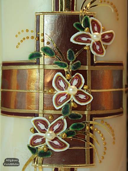 Plastisch modellierte Blüten und Ranken dekorieren diese Hochzeitskerze. Die Kerzenoberfläche ist rustikal veredelt. Jede Kerze wird von uns einzeln entworfen und handmodelliert, dadurch sind alle Kerzen Unikate.