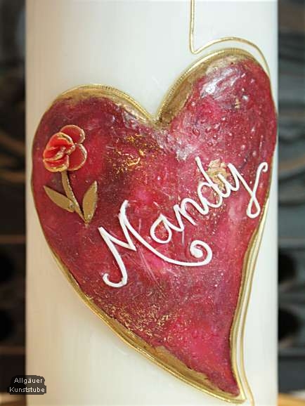 Bei dieser Hochzeitskerze sind zwei einzelne Kerzen mit jeweils einem Herz gestaltet. Jedes Herz ist mit einem Namen beschriftet. Die Herzen schmiegen sich zueinander, egal wie die beiden Kerzen gestellt werden. Das Herz ist so auf die Kerze gestaltet, dass der Schein der Flamme in der Kerze die Herzen leuchten lässt. Sonderanfertigung auf Kundenwunsch.