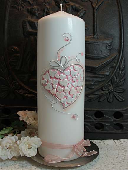 Hochzeitskerze mit geschwungenem Herz. Ein großes Herz dominiert bei dieser Kerze. Das Herz ist ausgefüllt mit vielen kleinen Wachsherzchen, die einzeln auf die Kerze aufgelegt sind und releifartig aus dem großen Herz hervortreten. Ein zartes Band schließt die Kerze am unteren Rand ab.