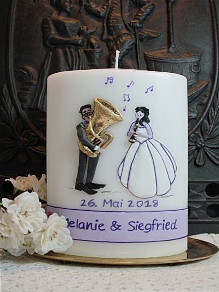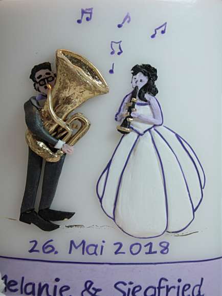 Individuelle Hochzeitskerze mit Musikerpaar. Das Brautpaar ist plastisch auf die Kerze aufmodeliert. Die Instrumente sind plastisch aus Wachs modelliert. Sonderanfertigung im Kundenauftrag.