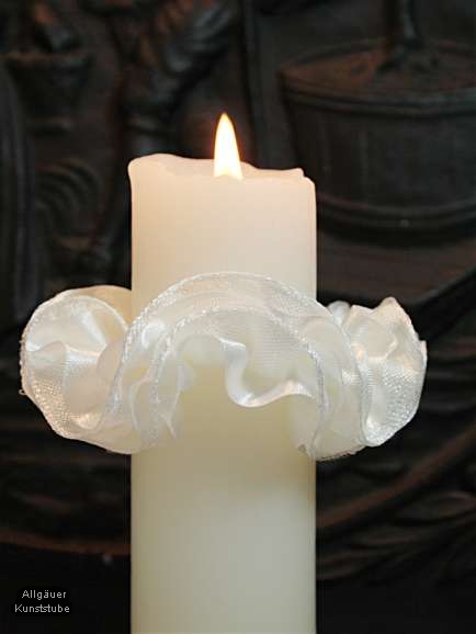 Wachstropfschutz in Rosettenform, dreilagig. Der Wachstropfschutz hat ein Gummiband und ist somit problemlos an der Kerze anzubringen. Er ist geeignet für Kerzen bis zu einem Duchmesser von 50 mm. Handarbeit.