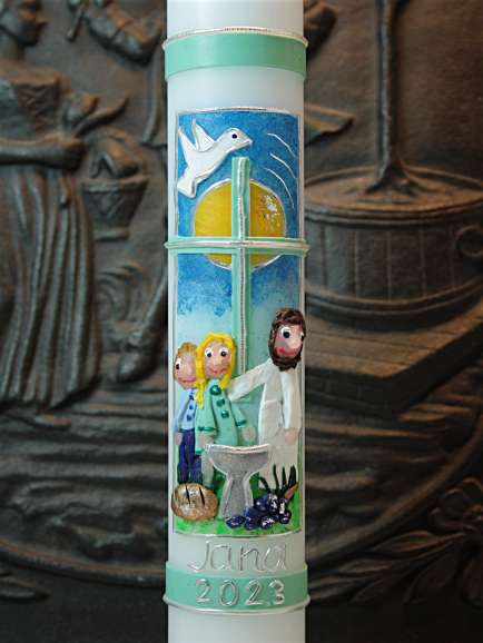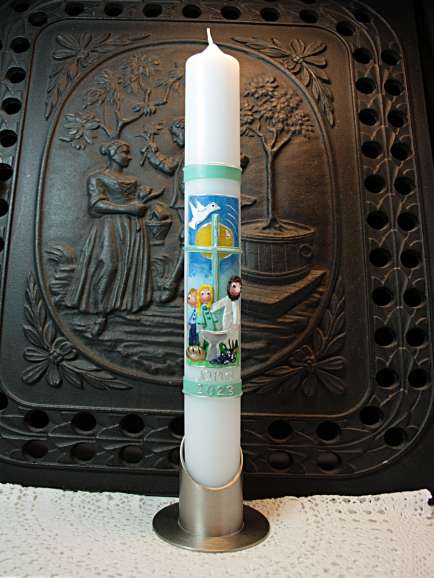 Kommunionkerze zum Thema: "Wir gehören zu dir". Christus lädt die Kinder zu sich an den Tisch.