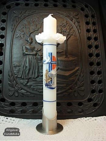 Elegante Kommunionkerze mit blauem Kreuz, Kelch, Taube und Ähren. Diese Kommunionkerze wirkt durch Ihre Farbgebung sehr edel und elegant. Ein blauer Halbedelstein befindet sich im Zentrum des Kreuzes. Die Elemente Kelch, Wein und Ähren sind reliefartig auf die Kerze aufmodelliert. Reine Wachsauflage, Einzelstück.
