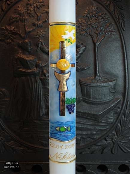 Farbenprächtige Kommunionkerze mit den Symbolen Kelch, Kreuz, Taube, Fisch und Wein. Bei dieser Kerze ist hauchdünnes Wachs auf die Kerze aufgelegt und bildet den Hintergrund. Ein plastisch modellierter Kelch, Trauben und ein Kreuz dominieren das Motiv.