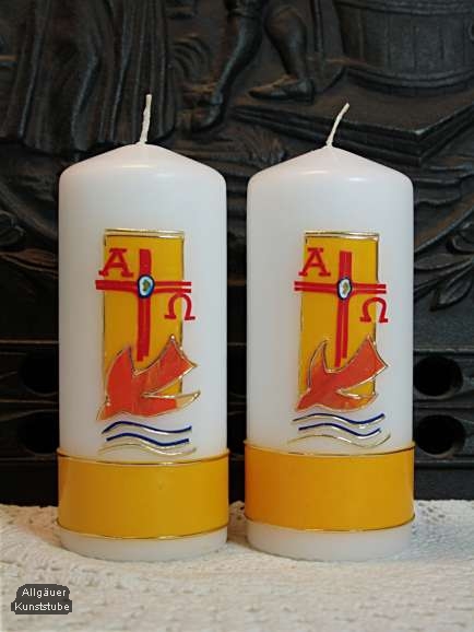Zur Kerze passend sind zwei Tischkerzen mit dem gleichen Motiv gestaltet. Diese sind im Preis enthalten.