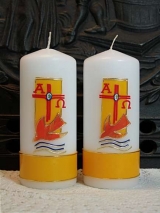 Kommunionkerze mit zwei passenden Tischkerzen. Diese Kommunionkerze ist in sehr fröhlichen und leuchtenden Farben gehalten. Ein Kreuz liegt vor einem Hintergrund. Die Taube ist in einem farblich passendem Farbton gehalten. Ergänzt wird die Kerze mit Wellen. Auf dem gelben Wachsband kann der Name und das Datum der Kommunion aufgelegt werden.