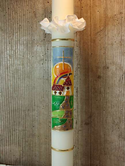 Farbenfrohe Kommunionkerze zum Thema: "Bei Gott sind wir zu Hause".