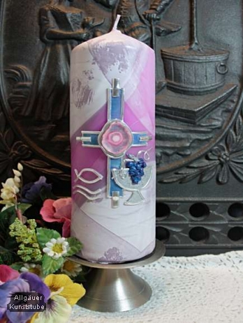 Ausgefallene Konfirmationskerze in modernem Design. Die Farbgebung und Gestaltung dieser Konfirmationskerze wirken sehr ausgefallen und edel. Eine geschliffene Glasscheibe bildet das Zentrum desKreuzes. Der reliefartig aufmodellierte Kelch und ein Ichtys-Symbol ergänzen das Gesamtbild der Kerze. Einzelstück.