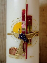 Moderne Konfirmationskerze mit Sonne, modernem Kreuz , Kelch und Wein. Diese Konfirmationskerze wirkt durch die Anordnung der Symbole sehr modern und edel. Alle Elemente sind mit reinem Wachs auf die Kerze aufgelegt. Einzelanfertigung.