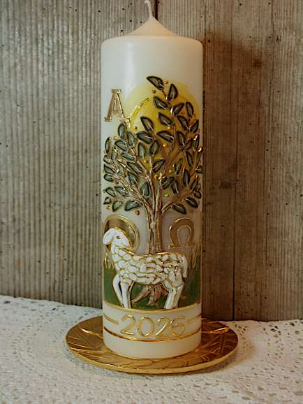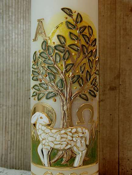 Osterkerze mit Sonne, Lebensbaum, Osterlamm und Alpha und Omega. Der Baum und das Lamm sind reliefartig auf die Kerze aufmodelliert.