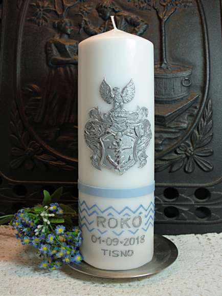 Schlicht gehaltene Taufkerze mit Familienwappen in den Farben Silber und Hellblau. Sonderanfertigung im Kundenauftrag.
