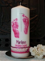 Elegante Taufkerze mit Füßchen nach den original Fußabdrücken des Kindes. Die Füßchen sind mit Wachs auf die Kerze aufgelegt, nicht gedruckt. Ein schlichtes Kreuz und eine Wachsbanderole ergänzt das Motiv. Auf der Rückseite der Kerze ist ein Spruch mit Wach aufgelegt. Sonderanfertigung im Kundenauftrag.