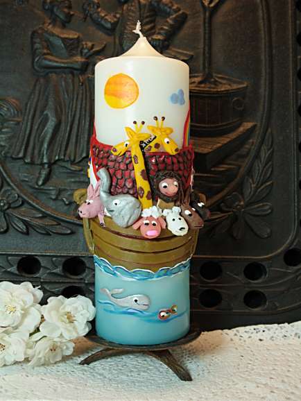 Plastisch modellierte Arche mit handmodellierten Tieren und Noah. Diese Arche Noah ist in sehr aufwändiger Gestaltung plastisch um die gesamte Arche modelliert. Jedes Tier ist einzeln modelliert und nicht gegossen. Alle Details sind von Hand auf die Kerze aufgelegt. Das Dach ist aus einzelnen Wachsschindeln zusammengesetzt. Das Besondere an dieser Kerze ist, dass diese von allen Seiten betrachtet werden kann.