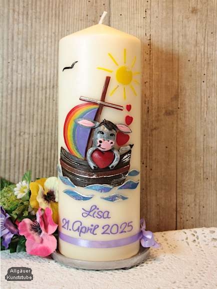 Kindgerechte Taufkerze mit Segelboot, Sonne und Wasser. Das Boot und der Esel sind plastisch modelliert.