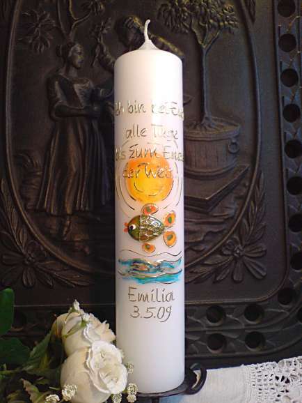 Individuelle Taufkerze mit Sonne, plastisch modelliertem Fisch und Taufspruch. Sonderanfertigung im Kundenauftrag.