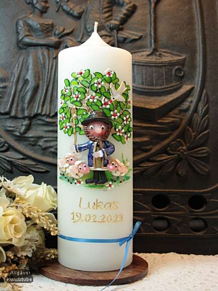 Taufkerze mit Lebensbaum, Hirte und Schafen. Der Hirte und die Schafe sind plastisch auf die Kerze aufmodelliert. Da die Figur handmodelliert ist, ist jede Kerze etwas anders und somit ein Unikat.