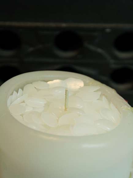 5. Jetzt können Sie die Kerze wieder anzünden. Die Wachschips schmelzen sich durch die Flamme in den Kerzenkrater.