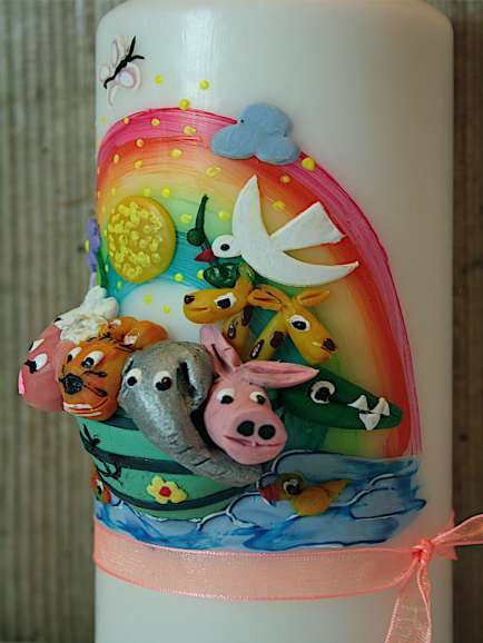 Taufkerze mit plastisch modellierter Arche und großem Regenbogen. Jedes einzelne Tier ist aus Wachs handmodelliert.